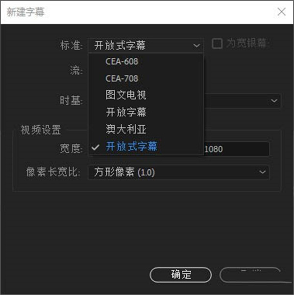 3、选择“开放式字幕”,注意,不是“开放字幕”而是“开放式字幕”。视频设置中尺寸和像素长宽比和序列一致即可