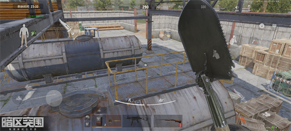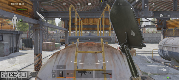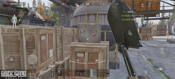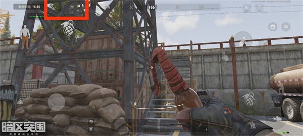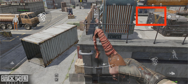 我们来到左边这个油罐箱子这里,靠近箱子触发攀爬跑到箱子上面去。