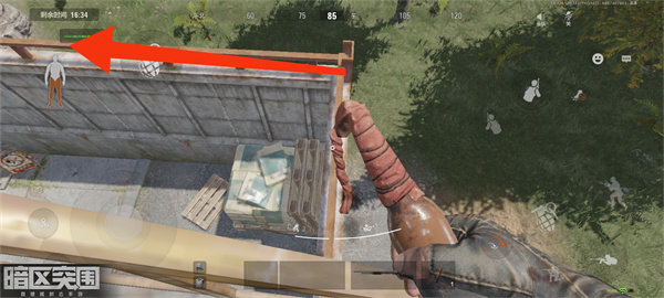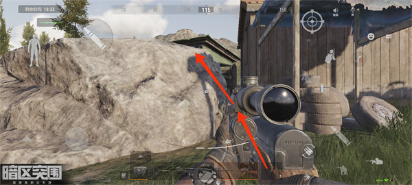 来到石头上面阵地蓝色棚顶的角落(标注准星的位置),连接就是拉满快跑就能跳到顶上去。