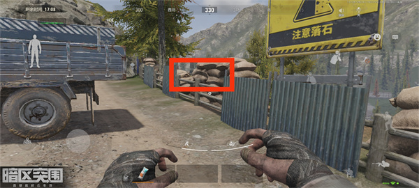 我们来到房车营地房屋后面这俩卡车这里。然后在红色方框位置那里翻到沙包上面。