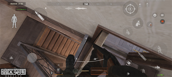 我们站在门上可以拿枪对准楼梯下面上来的人,因为这个楼梯间小,敌人转向会比较麻烦,我们很容易就能击杀敌人。