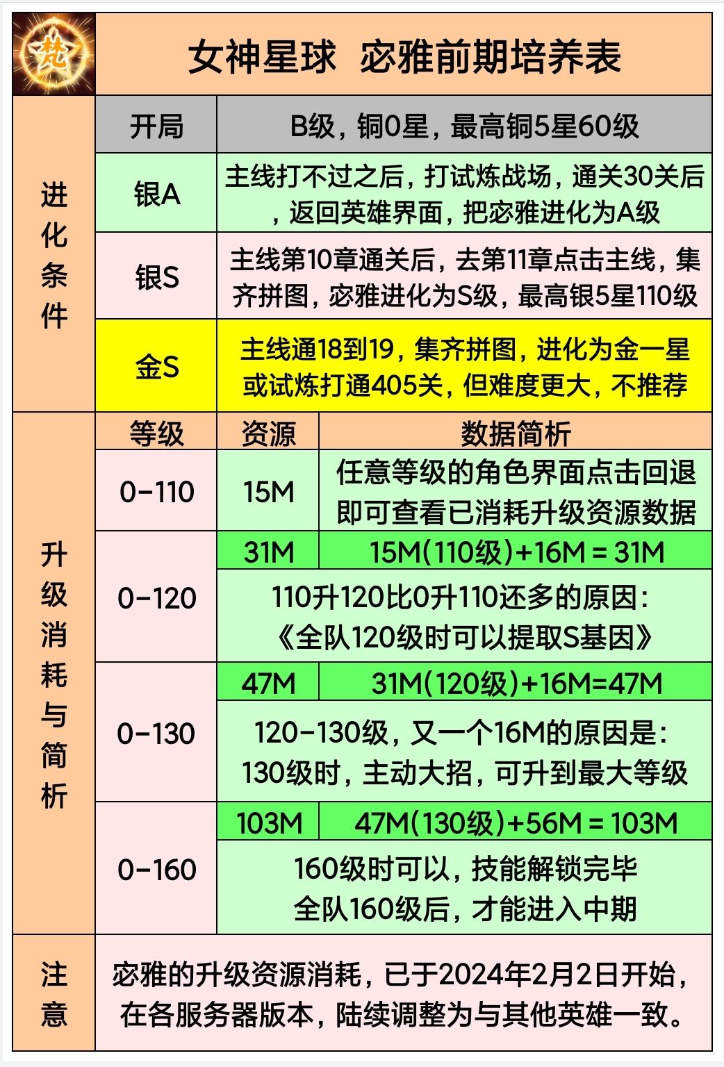 ②建议。宓雅保持最低星阶即可 。可以是金1星,也可以参考镰组,升红银5星,但进化优先级很低,个人选择。